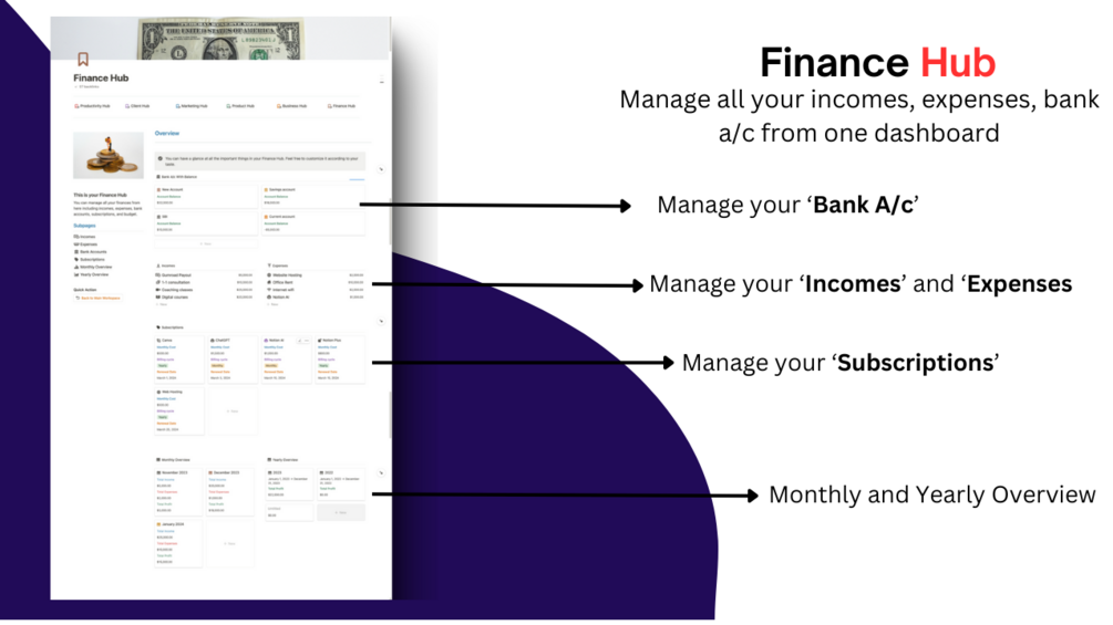 - Finance Hub- To manage all my finances including income, expenses, bank a/c, subscriptions, monthly overview and yearly overview.